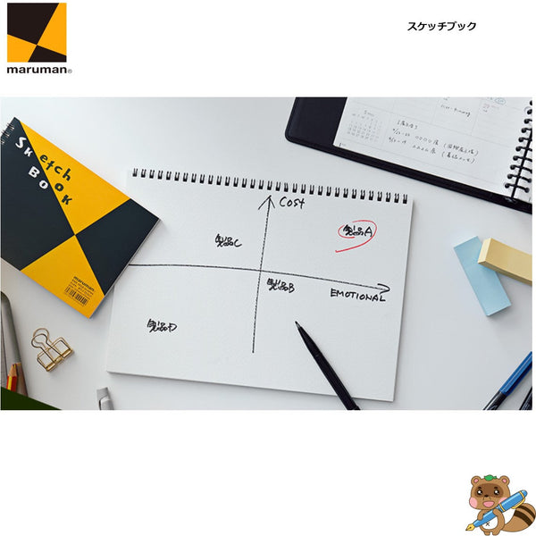 スケッチブックといえばマルマンの「図案スケッチブック」 アマチュアからプロまで、あらゆるユーザーに長きにわたって愛用されている、日本を代表する画用紙です。 ●サイズ:A3 ●本体寸法:縦420×横297×厚6㎜ ●本文寸法:縦420X横297㎜ ●重量:520g ●表紙素材:表表紙:コートボール紙/裏表紙:コートボール紙 ●製本:ツインワイヤ ●本文:24枚 ●用紙(紙の種類):画用紙並口 126.5g/㎡ ●生産国:日本