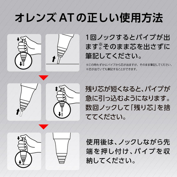 「思考を止めない、自動芯出し機構」 ノック1回でずっと書き続けられる「自動芯出し機構」と、ペン先のパイプで芯を守って書く「オレンズシステム」、しっかり握れる「デュアルグリップ」を搭載し、これまで以上に集中力が途切れず思考し続けられる「オレンズ」の新モデル登場です。 ●本体サイズ/重さ:W12×D11×H136mm/15g ●ブリスターサイズ/重さ:W53×D22×H200mm/31g