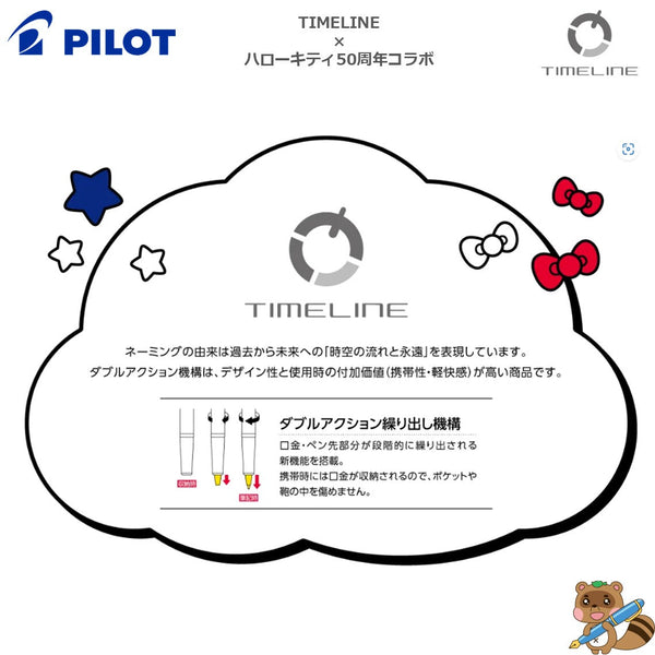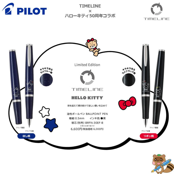 50周年を迎えたハローキティ これからも輝き続けてほしいという願いを込めたオリジナルデザインです。 ●種類:油性ボールペン ●ボール径:0.5mm ●方式:ダブルアクション繰り出し式 ●インキ:アクロインキ ●インキ色:黒 ※専用ケース・紙箱付 ※替芯(別売):BRFN-30EF-B