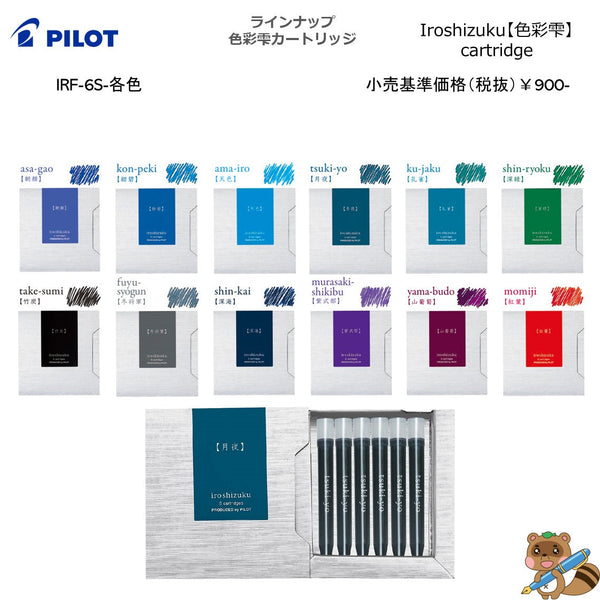 日本の美しい情景をモチーフにした万年筆インキ『色彩雫(いろしずく)』のカートリッジタイプ 携帯に便利でインキの補充が手軽にできるため、既に『色彩雫』をご愛用いただいている方はもちろん、様々な色を手軽に楽しみたい方、これから『色彩雫』を使ってみたいという方に最適です。 ●内容量:6本入り 0.9cc/1本 ●インキ:一般書記用インキ ●インキ色:朝顔、紺碧、天色、月夜、孔雀、深緑、竹炭、冬将軍、深海、紫式部、山葡萄、紅葉