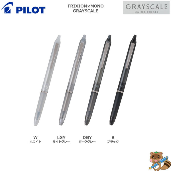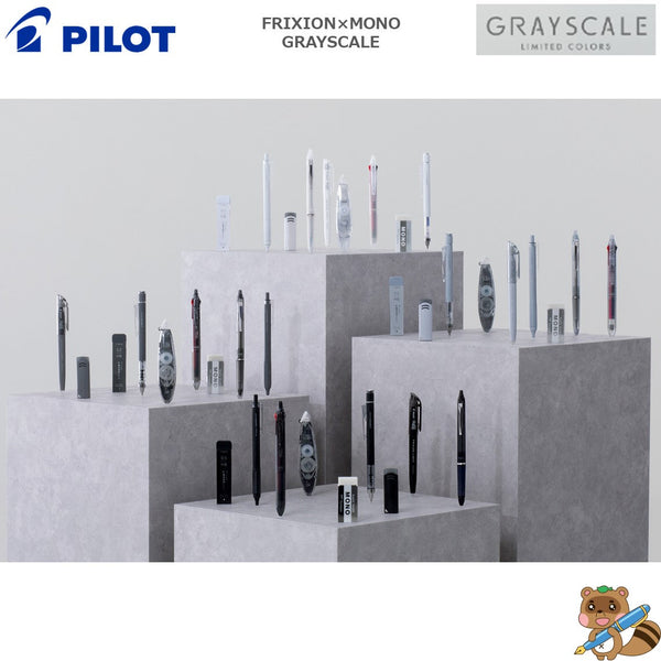FRIXION、MONOの2ブランドのコラボ 書く、消すが楽しめる商品ラインアップです ●商品名:消せるボールペン『フリクションボールノックゾーン 05 グレースケール』 ●方式:クリップスライドノック式 ●ボール径: 0.5mm(極細) ●消去用ラバー:エラストマー ●インキ: プレミアムフリクションインキ(水性ゲルインキ)※完全消色温度/65℃前後 ●インキ色: 黒 ●ボディカラー:ホワイト、ライトグレー、ダークグレー、ブラック ●サイズ:全長 150mm 最大径11.1mm