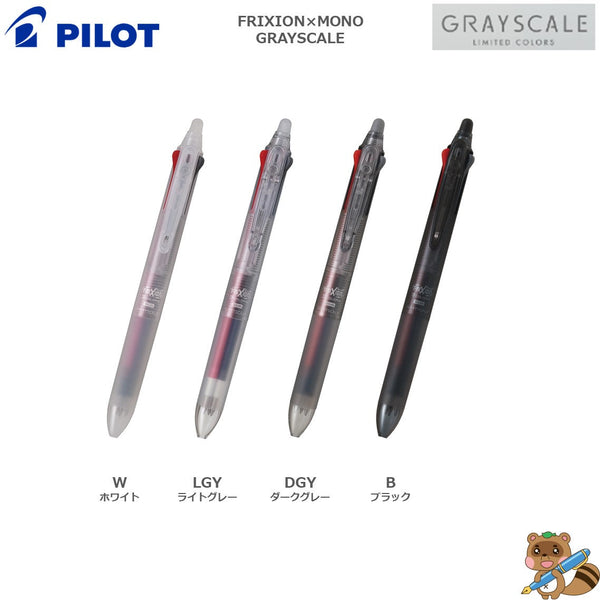 FRIXION、MONOの2ブランドのコラボ 書く、消すが楽しめる商品ラインアップです ●商品名:消せる3色ボールペン『フリクションボール3スリム 038 グレースケール』 ●方式:スライドレバー式 ●ボール径: 0.38mm(超極細) ●消去用ラバー:エラストマー ●インキ:フリクションインキ(水性ゲルインキ) ※完全消色温度/65℃前後 ●インキ色: 黒・赤・青 ●ボディカラー:ホワイト、ライトグレー、ダークグレー、ブラック ●サイズ:全長 145mm 最大径12.8mm