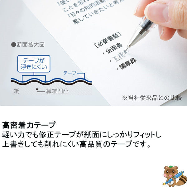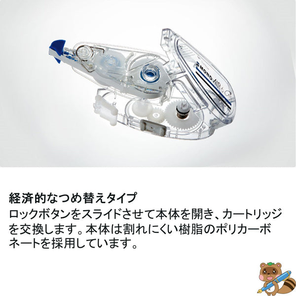 新機構「エアータッチシステム」を搭載し、使いきるまで驚くほど軽く消せる修正テープ「モノエアー」のつめ替えタイプです。