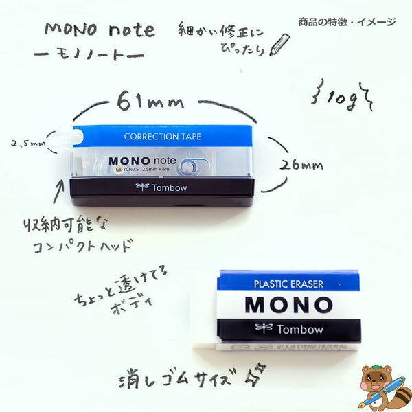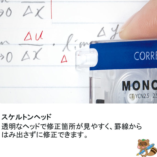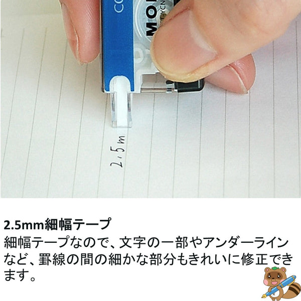 ノートの細かい修正に最適な2.5mm細幅テープ。 狙った箇所が見やすく、ノートの罫線に沿ってまっすぐ修正しやすいスケルトンヘッド。 携帯時にテープを保護し、片手で簡単に操作できるスライドヘッド機構。 収納・携帯に便利な消しゴムサイズ。 2014年度グッドデザイン賞ベスト100受賞 ●仕様:幅2.5mm×長さ4m ●本体サイズ:幅26×厚さ13×全長61mm/重量10g ※ブリスターパック入り ※使いきりタイプ