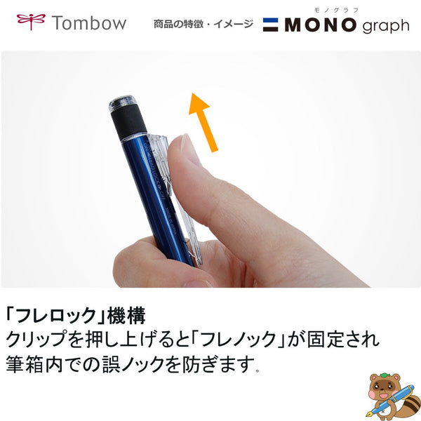 クリップを押し上げるとフレノックが固定される「フレロック」機構も搭載。筆箱内での誤ノックを防止します。
