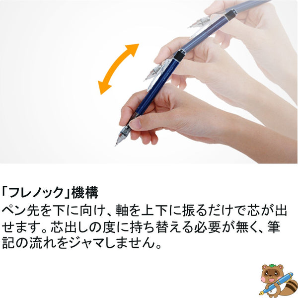 振って芯を出す「フレノック」機構搭載。クリップをノックしても芯を出せます。